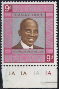 Malawi Malawi Philately: 1966 Republic Day – 9d Dr H Kamuzu Banda, President thedigitalphilatelist 06/07/1966 Details Designer: Michael Goaman Printer: Harrison & Sons Ltd, London Process: Photogravure Paper: Watermark: Cockerels Perf: 14 x 14.5 (comb) Cylinders: 1A (Sepia) 1A (Brown) 1A (Silver) 1A (Magenta) Sheet: 6 x 10 (60) Quantity: Cylinder Numbers