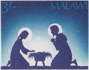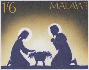 The 1967 Christmas issue portrays the silhouetted figures of Mary and Joseph kneeling by the side of the crib.