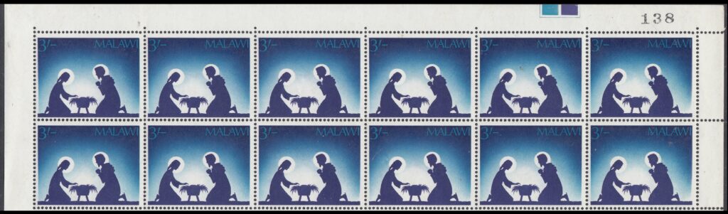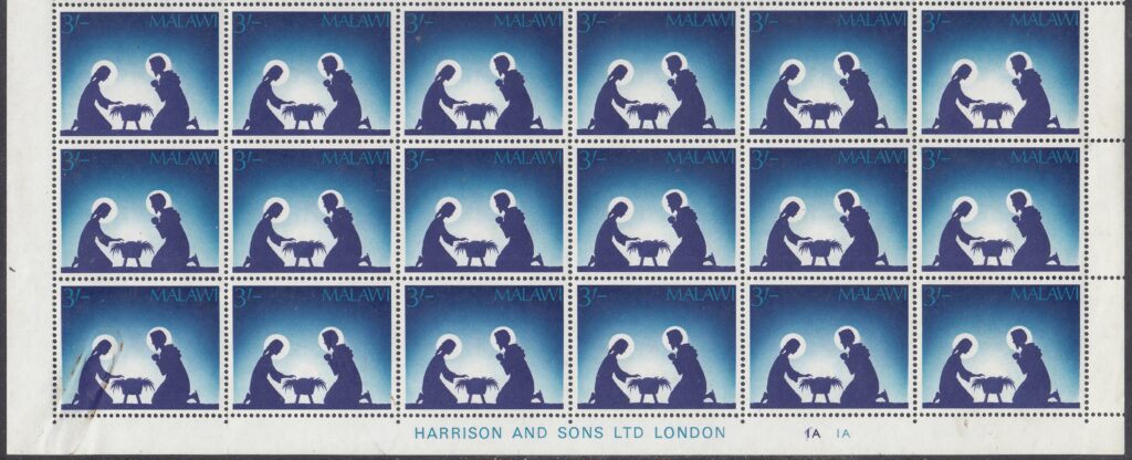 Malawi Malawi Philately: 1967 Christmas – 3s Mary and Joseph thedigitalphilatelist 21/11/1967 Details Designer: Jennifer Toombs Printer: Harrison & Sons Ltd, London Process: Photogravure Paper: Watermark: Cockerels Perf: 14.5 x 14 Cylinders: 1A (Royal Blue), 1A (New Blue) Sheet: 10 x 6 (60) Quantity: Cylinder Numbers & Imprint Sheet Numbers