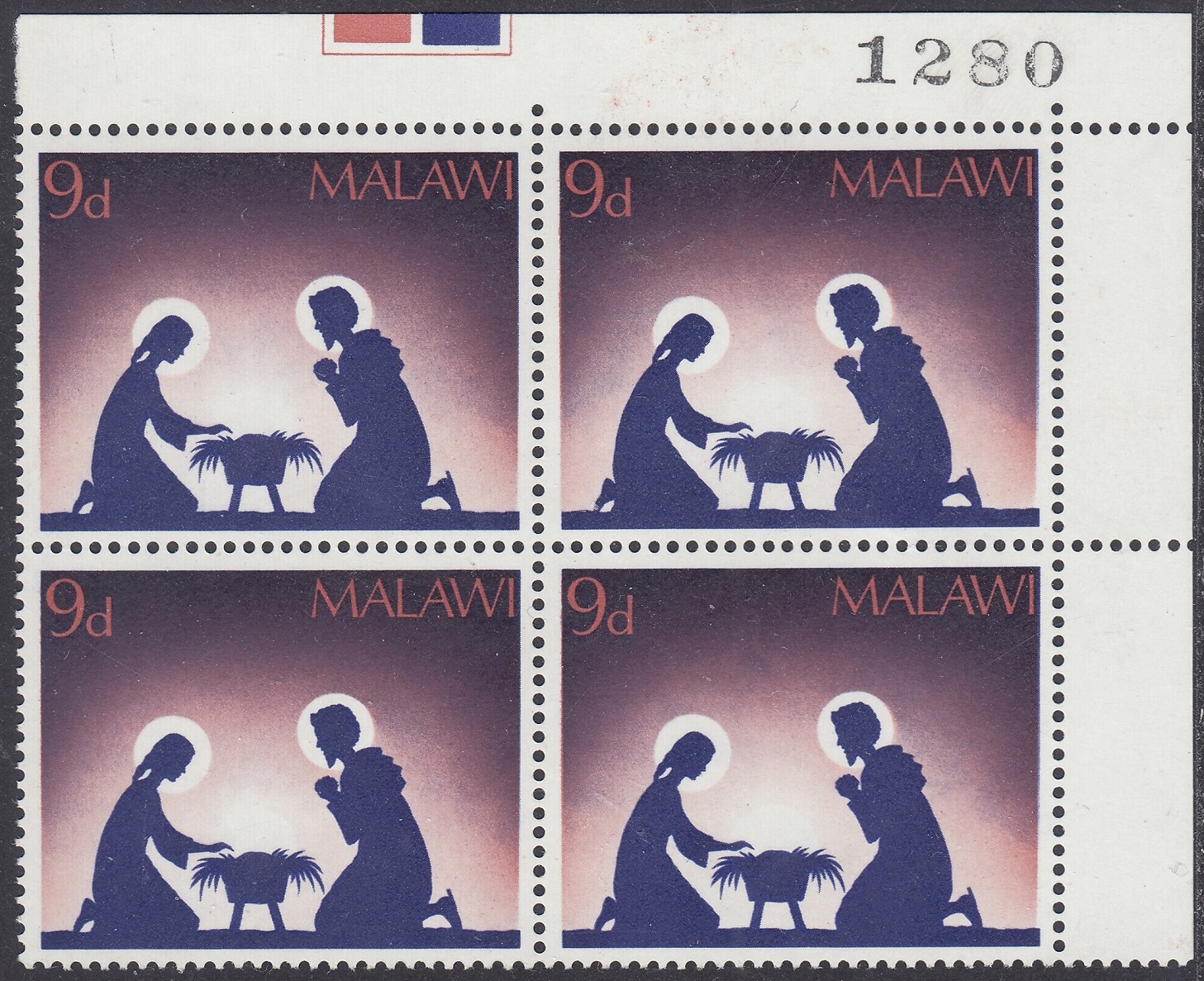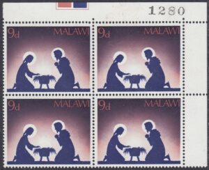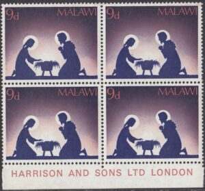 Malawi Malawi Philately: 1967 Christmas – 9d Mary and Joseph thedigitalphilatelist 21/11/1967 Details Designer: Jennifer Toombs Printer: Harrison & Sons Ltd, London Process: Photogravure Paper: Watermark: Cockerels Perf: 14.5 x 14 Cylinders: Sheet: 10 x 6 (60) Quantity: Sheet Numbers