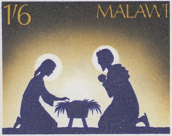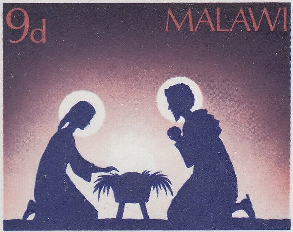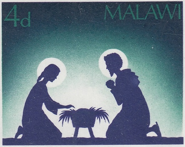 The  1967 Christmas issue portrays the silhouetted figures of Mary and Joseph kneeling by the side of the crib.