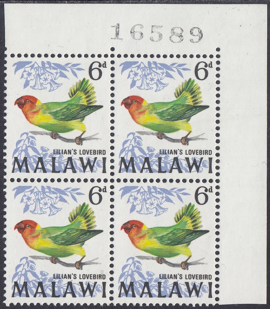Malawi Malawi Philately: 1968 Definitive Stamps – 6d Yellow Bishop thedigitalphilatelist 13/11/1968 Details Designer: Victor Whiteley Printer: Harrison & Sons Ltd, London Process: Photogravure Paper: Watermark: Cockerels Perf: 14.5 (comb) Cylinders: 1B 1B 1B 1B 1B Sheet: R6 x 10 (60 stamps) Quantity: Sheet Numbers Share this: Share on Facebook (Opens in new window) Facebook Share on X (Opens in new window) X Like this:Like Loading... Related