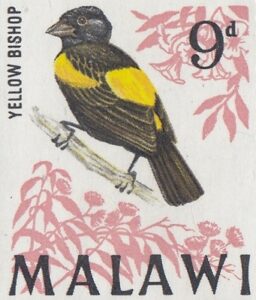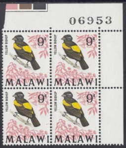 Malawi Malawi Philately: 1968 Definitive Stamps – 9d Lillian’s Lovebird thedigitalphilatelist 13/11/1968 Details Designer: Victor Whiteley Printer: Harrison & Sons Ltd, London Process: Photogravure Paper: Watermark: Cockerels Perf: 14.5 (comb) Cylinders: 1B 1B 1B 1B Sheet: R6 x 10 (60 stamps) Quantity: Sheet Numbers