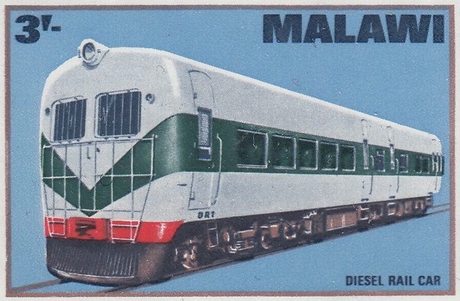 Malawi Malawi Philately: 1968 Malawi Locomotives – 3s Diesel Rail Car thedigitalphilatelist 24/07/1968 Details Designer: Richard Granger Barrett Printer: Harrison & Sons Ltd, London Process: Photogravure Paper: Watermark: Cockerels Perf: 14 x 14.5 (comb) Cylinders: 1A 1A 1A 1A 1A Sheet: R5 x 12 (60) Quantity: