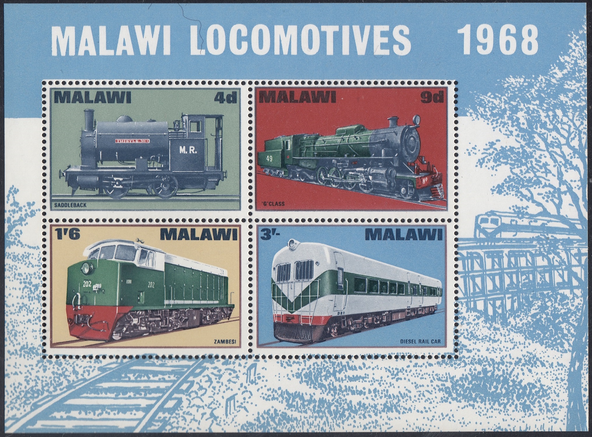 Malawi Malawi Philately: 1968 Malawi Locomotives – 5s 7d Miniature Sheet thedigitalphilatelist 24/07/1968 Details Designer: Richard Granger Barrett Printer: Harrison & Sons Ltd, London Process: Photogravure Paper: Watermark: Cockerels Perf: 14.5 (comb) Cylinders: Sheet: Quantity: