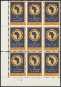 Malawi Malawi Philately: 1969 African Development Bank – 3/- ADB Logo James Gavin 10/09/1969 Details Designer: László Gyula Vásárhelyi Printer: De La Rue Process: Lithography Paper: Watermark: Cockerels Perf: 14 (comb) Cylinders: 1B (Brownish-Yellow), 1B (Yellowish-Brown), 1B (Deep Blue) Sheet: R5 x 6 (30 stamps) Quantity: Cylinder Numbers