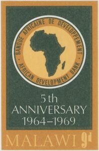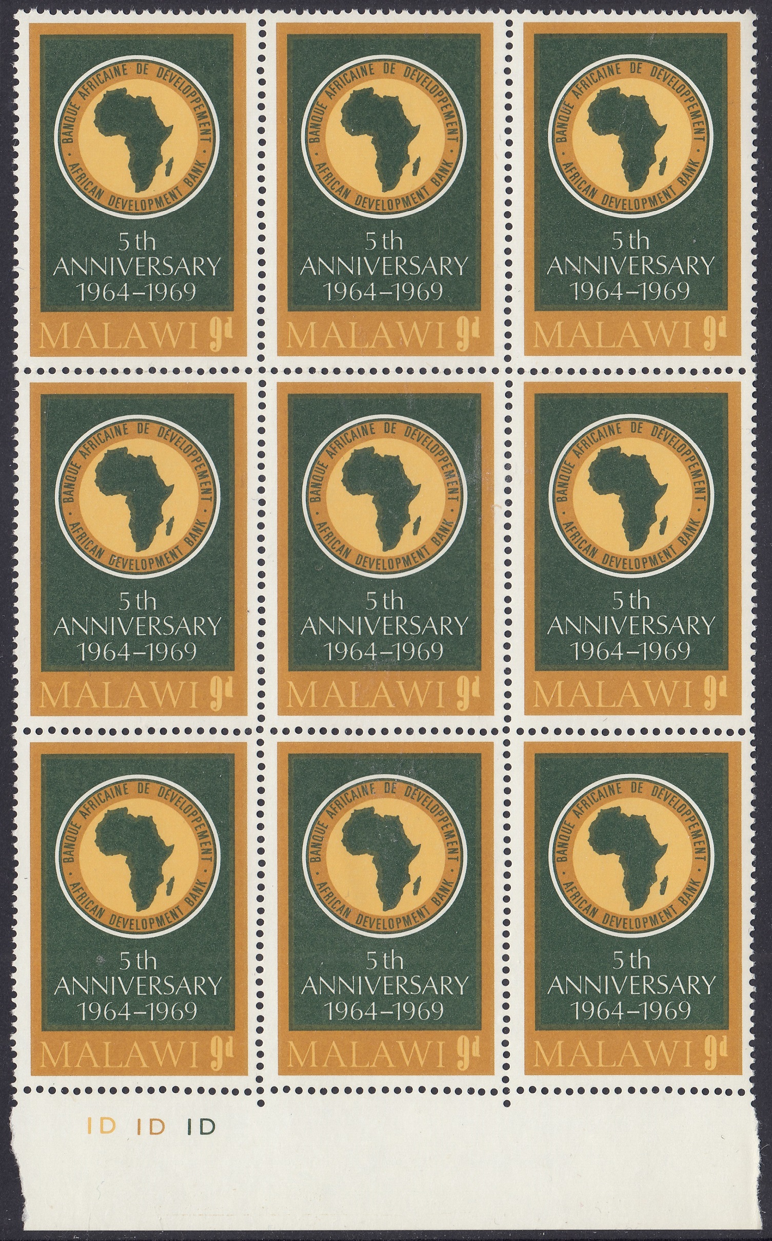 Malawi Malawi Philately: 1969 African Development Bank – 9d ADB Logo James Gavin 10/09/1969 Details Designer: László Gyula Vásárhelyi Printer: De La Rue Process: Lithography Paper: Watermark: Cockerels Perf: 14 (comb) Cylinders: 1D (Brownish-Yellow), 1D (Yellowish-Brown), 1D (Deep Green) Sheet: R5 x 6 (30 stamps) Quantity: Cylinder NUmbers