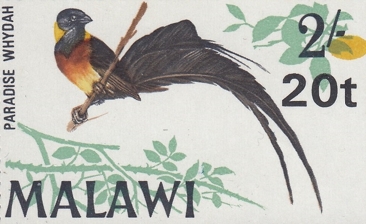 General colouring black with hind neck golden and belly white. It is widely distributed and not uncommon in small flocks, feeding on the ground. In the breeding season the male makes a display flight from one high tree top to another in which the tail is expanded vertically but carried straight out behind.