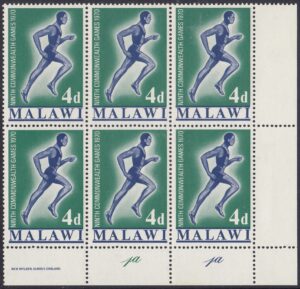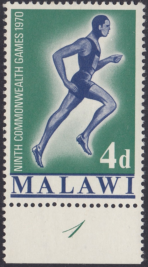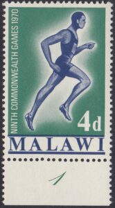 Malawi Malawi Philately: 1970 Ninth Commonwealth Games – 4d Runner thedigitalphilatelist 03/06/1970 Details Designer: John Cooter Printer: Bradbury Wilkinson & Co Ltd, New Malden, Surrey, England Process: Lithography Paper: Watermark: Cockerels Perf: 13 Cylinders: 1 (Green), 1 (Blue) 1a (Green), 1a (Blue) Sheet: Quantity: Cylinders