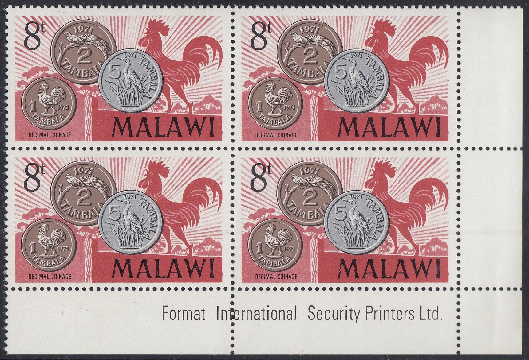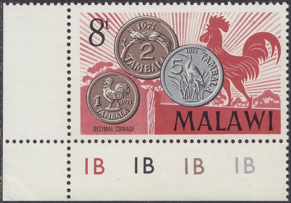 Malawi Malawi Philately: 1971 Introduction of Decimal Currency – 8t Coinage and Rooster thedigitalphilatelist 15/02/1971 Details Designer: Victor Whiteley Printer: Format International Security Printers Ltd Process: Lithography Paper: Watermark: Cockerels (sideways) Perf: 14 (comb) Cylinders: 1B (Red), 1B (Black), 1B (Gold), 1B (Silver) Sheet: Quantity: Cylinder Numbers Share this: Share on Facebook (Opens in new window) Facebook Share on X (Opens in new window) X Like this:Like Loading... Related