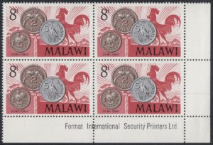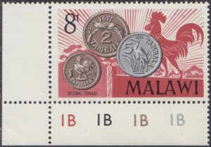 Malawi Malawi Philately: 1971 Introduction of Decimal Currency – 8t Coinage and Rooster thedigitalphilatelist 15/02/1971 Details Designer: Victor Whiteley Printer: Format International Security Printers Ltd Process: Lithography Paper: Watermark: Cockerels (sideways) Perf: 14 (comb) Cylinders: 1B (Red), 1B (Black), 1B (Gold), 1B (Silver) Sheet: Quantity: Cylinder Numbers