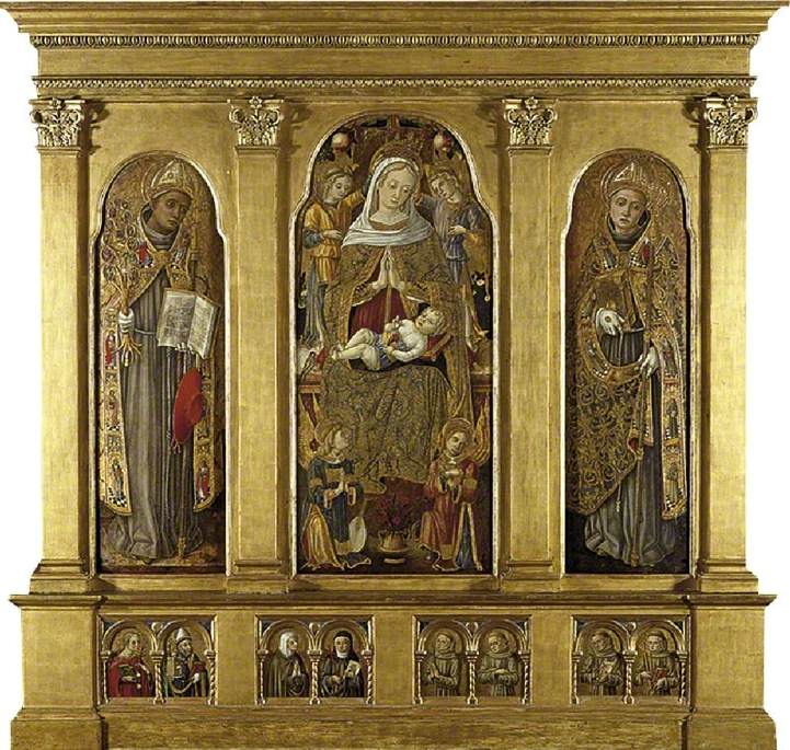 The image depicts the Virgin and Child enthroned with St Bonaventura (left) and St Louis of Toulouse (right). Below the main three panels are four pairs of figures of Saints: St Agatha and St Augustine; an unidentified female Franciscan Saint and St Clar.