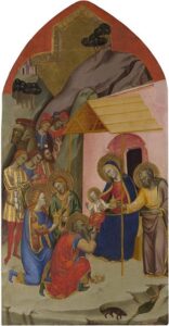 The image taken from the upper tier panel of a large, four-tiered altarpiece created for the high altar of the choir of the church of San Pier Maggiore in Florence. The altarpiece was most probably commissioned by the wealthy Florentine Albizzi family.