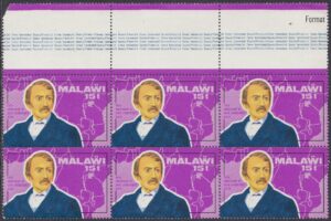 Malawi Malawi Philately: 1973 100th Anniversary of the Death of David Livingstone I – 15t David Livingstone thedigitalphilatelist 01/05/1973 Details Designer: John Waddington of Kirkstall Ltd, Leeds, England Printer: Format International Security Printers Ltd Process: Lithography Paper: Watermark: Cockerels (sideways) Perf: 13.5 x 14 (comb) Cylinders: Sheet: Quantity: