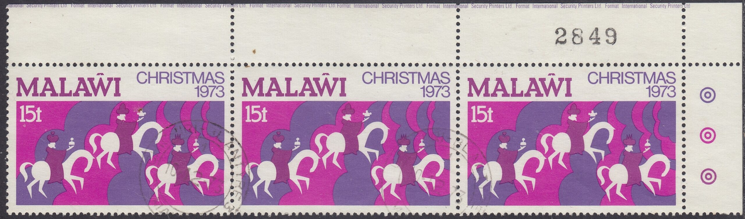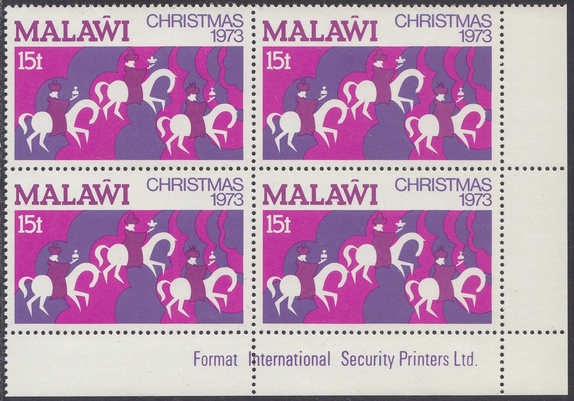 Malawi Malawi Philately: 1973 Christmas – 15t Three Wise Men thedigitalphilatelist 17/11/1973 Details Designer: John Waddington of Kirkstall Ltd, Leeds, England Printer: Format International Security Printers Ltd Process: Lithography Paper: Watermark: Cockerels Perf: 13.5 (comb) Cylinders: Sheet: Quantity: Sheet Numbers