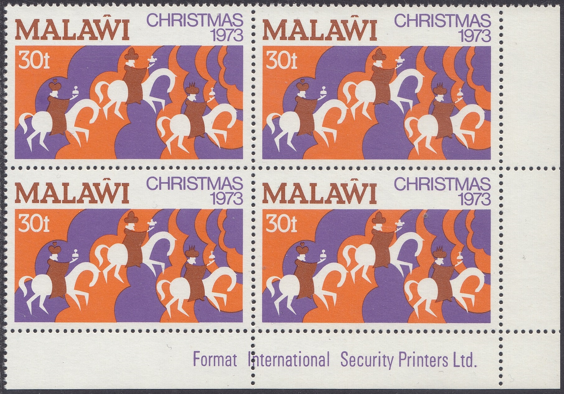 Malawi Malawi Philately: 1973 Christmas – 30t Three Wise Men thedigitalphilatelist 17/11/1973 Details Designer: John Waddington of Kirkstall Ltd, Leeds, England Printer: Format International Security Printers Ltd Process: Lithography Paper: Watermark: Cockerels Perf: 13.5 (comb) Cylinders: Sheet: Quantity: