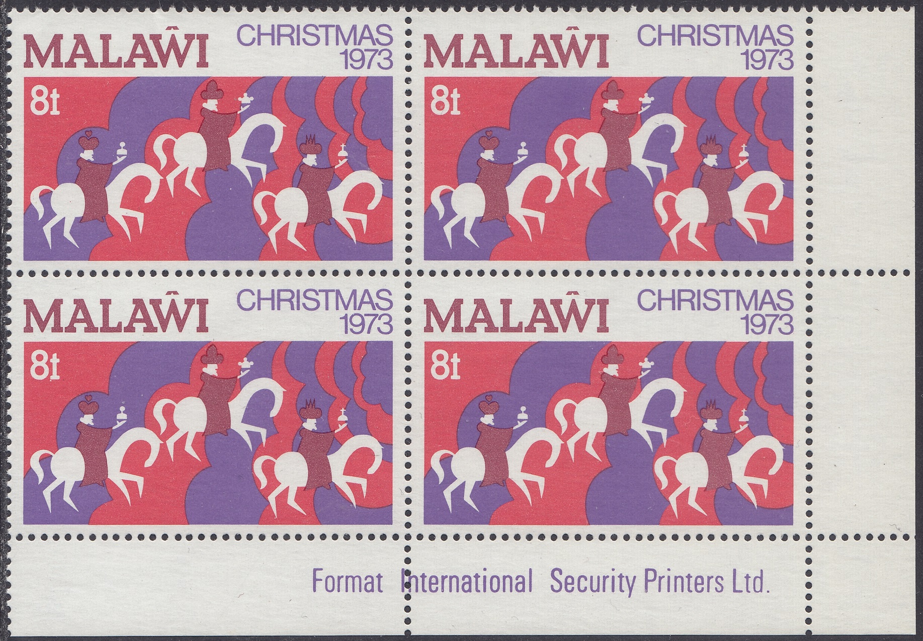 Malawi Malawi Philately: 1973 Christmas – 8t Three Wise Men thedigitalphilatelist 17/11/1973 Details Designer: John Waddington of Kirkstall Ltd, Leeds, England Printer: Format International Security Printers Ltd Process: Lithography Paper: Watermark: Cockerels Perf: 13.5 (comb) Cylinders: Sheet: Quantity: