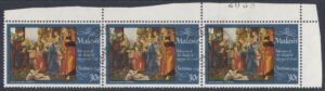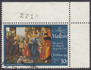 Under a ruined hut (a symbol of the declining pagan and Hebraic religions, is depicted the adoration of Jesus, who lies on a veil over a pile of straw. On the left, in a semicircle, are a shepherd with a lamb (symbol of Christ’s sacrifice) looking on the left, two praying shepherds, the Virgin, two standing and one kneeling angels with red clothes, and a standing St. Joseph.
