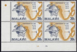 Malawi Malawi Philately: 1974 Universal Postal Union Centenary (1874-1974) – 30t U.P.U. Logo and Map of Malawi thedigitalphilatelist 24/04/1974 Details Designer: John Cooter Printer: John Waddington of Kirkstall Ltd, Leeds, England Process: Lithography Paper: Watermark: Cockerels (sideways) Perf: 13.5 (comb) Cylinders: 1A (Yellowish-Brown), 1A (Deep Greyish-Blue) Sheet: Quantity: Cylinders