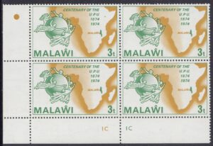 Malawi Malawi Philately: 1974 Universal Postal Union Centenary (1874-1974) – 3t U.P.U. Logo and Map of Malawi thedigitalphilatelist 24/04/1974 Details Designer: John Cooter Printer: John Waddington of Kirkstall Ltd, Leeds, England Process: Lithography Paper: Watermark: Cockerels (sideways) Perf: 13.5 (comb) Cylinders: 1C (Yellowish-Brown), 1C (Greyish-Green) Sheet: Quantity: Cylinders