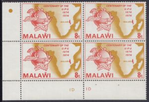 Malawi Malawi Philately: 1974 Universal Postal Union Centenary (1874-1974) – 8t U.P.U. Logo and Map of Malawi thedigitalphilatelist 24/04/1974 Details Designer: John Cooter Printer: John Waddington of Kirkstall Ltd, Leeds, England Process: Lithography Paper: Watermark: Cockerels (sideways) Perf: 13.5 (comb) Cylinders: 1D (Yellowish-Brown), 1D (Red) Sheet: Quantity: Cylinders
