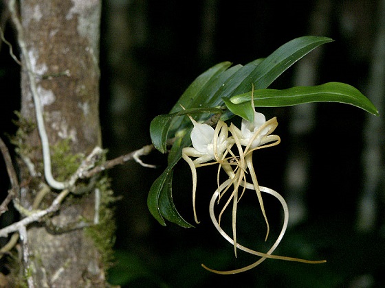 This rather rare and attractive species has the distinction of having the largest flowers of the South African monopodial epiphytic orchids. It normally forms untidy clumps of long, thin, pendulous sterns which carry small dark-green, linear leaves spaced along the stems in two ranks. The solitary white flower have a distinct shell-like lip and a long spur. Flowers appear from September to November.
