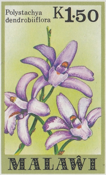 Polystachya dendrobiiflora is found growing on shrubs in the montane grasslands of Burundi, Congo, Zaire, Kenya, Tanzania, Angola, Malawi, Mozambique, Zambia and Zimbabwe at elevations of 400 to 2150 meters.