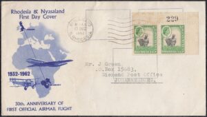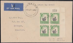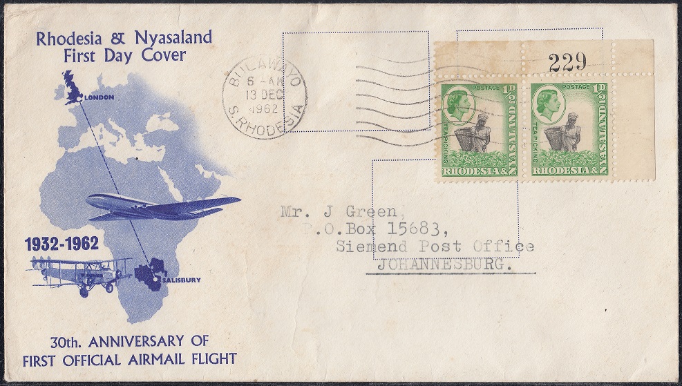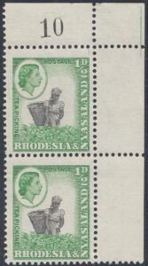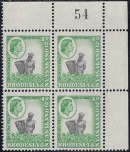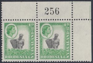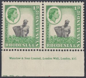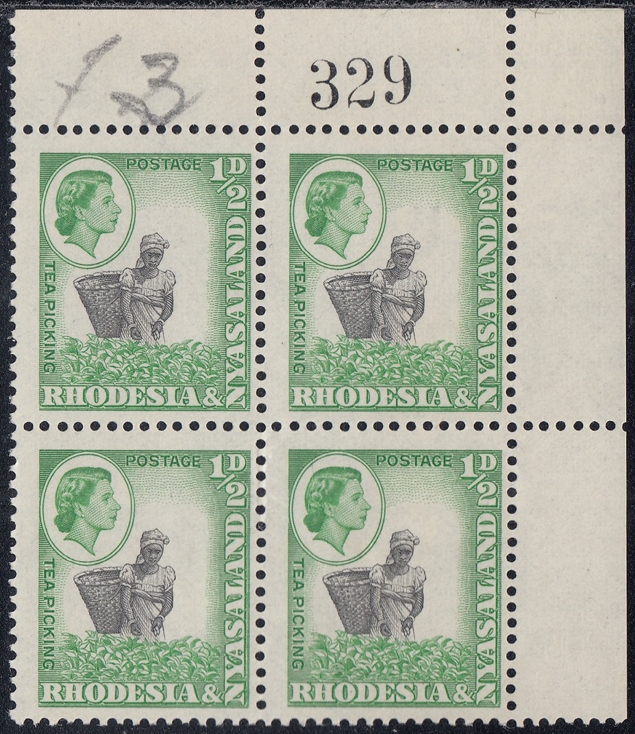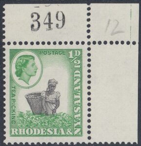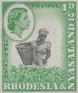 The ½d. design, which depicts an African woman with a basket picking tea in Nyasaland, was compiled from two photographs taken by Messrs. R. K. D-Hadden and R. L. Kinsey, both of the Public Relations Department. The former showed a woman picking tea and the latter a male African performing the same task, but with a basket.