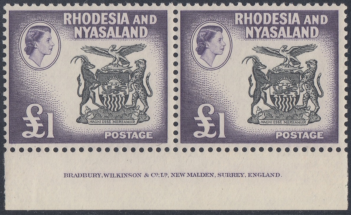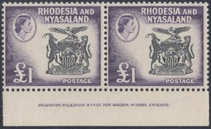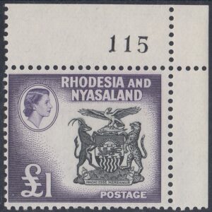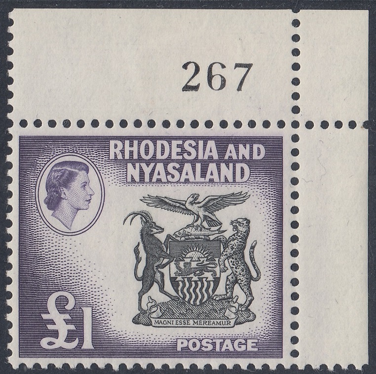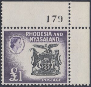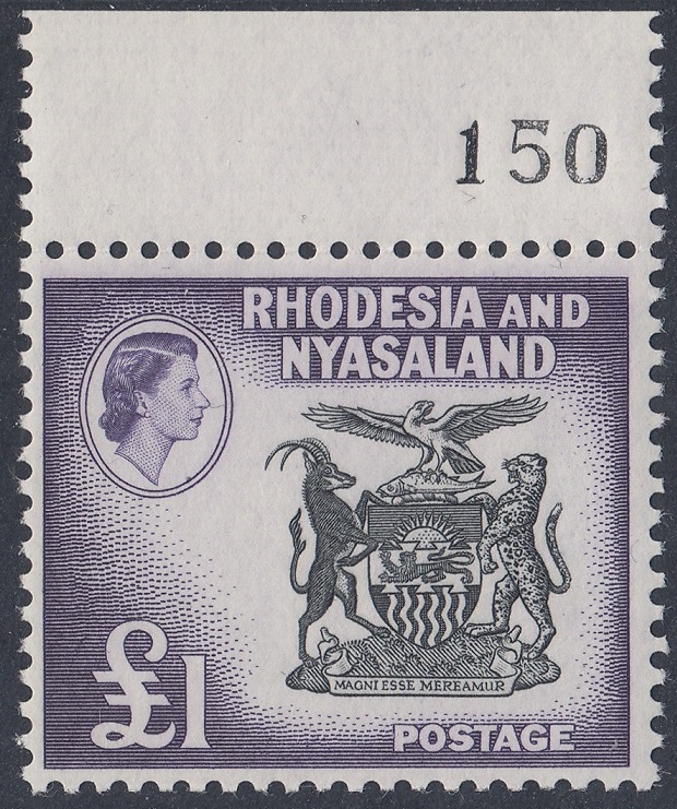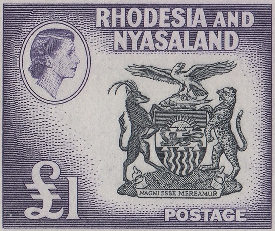 This stamp depicts the Federation’s cost of arms. The individual territories have two elements from their individual cost of arms and the motto is Motto: “Magni Esse Mercamur” (Let us deserve to be Great).