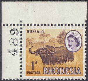 Rhodesia Rhodesia Philately: 1966 Definitive Issue – 1d Buffalo thedigitalphilatelist 09/02/1966 Details Subject: Buffalo Designer: Victor Whiteley Printer: Harrisons and Sons Ltd, London Process: Photogravure Paper: White paper with clear gum Watermark: None Perf: 14.5 (comb) Cylinders: 1A 1A Sheet: R20 x 12 (240 stamps) Quantity: 1,920,000 Sheet Numbers References The Encyclopaedia of Rhodesian & Zimbabwe Stamps 1964-2022