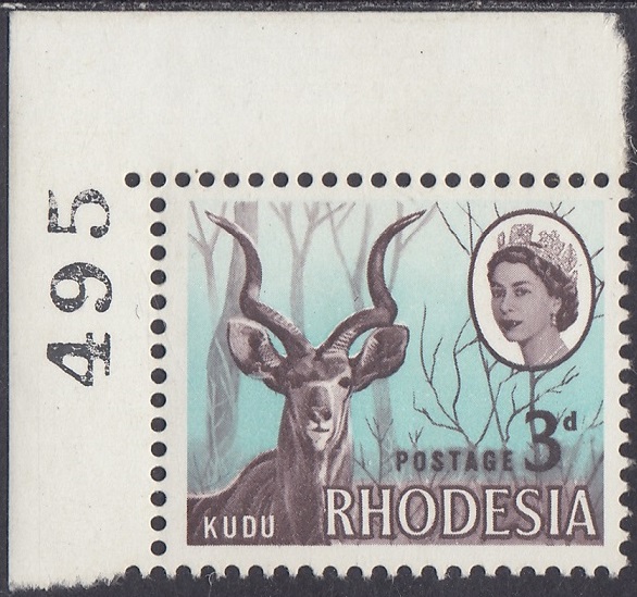 Rhodesia Rhodesia Philately: 1966 Definitive Issue – 3d Kudu thedigitalphilatelist 09/02/1966 Details Subject: Kudu Designer: Victor Whiteley Printer: Harrisons and Sons Ltd, London Process: Photogravure Paper: White paper with clear gum Watermark: None Perf: 14.5 (comb) Cylinders: 1A 1A Sheet: R20 x 12 (240 stamps) Quantity: 34,320,000 Sheet Numbers References The Encyclopaedia of Rhodesian & Zimbabwe Stamps 1964-2022 Share this: Share on Facebook (Opens in new window) Facebook Share on X (Opens in new window) X Like this:Like Loading... Related