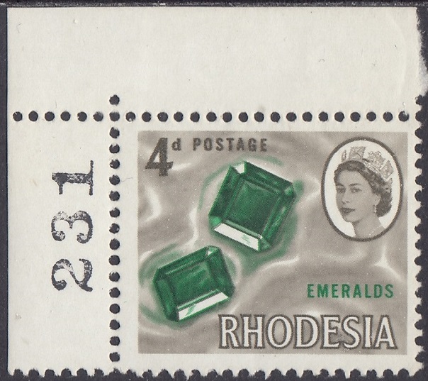 Rhodesia Rhodesia Philately: 1966 Definitive Issue – 4d Emeralds thedigitalphilatelist 09/02/1966 Details Subject: Emeralds Designer: Victor Whiteley Printer: Harrisons and Sons Ltd, London Process: Photogravure Paper: White paper with clear gum Watermark: None Perf: 14.5 (comb) Cylinders: 1A 1A Sheet: R20 x 12 (240 stamps) Quantity: 3,100,080 Sheet Numbers References The Encyclopaedia of Rhodesian & Zimbabwe Stamps 1964-2022 Share this: Share on Facebook (Opens in new window) Facebook Share on X (Opens in new window) X Like this:Like Loading... Related