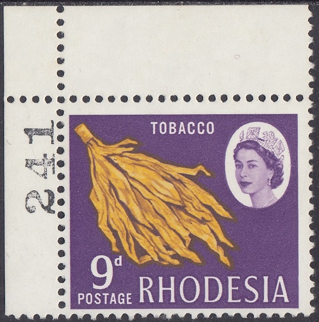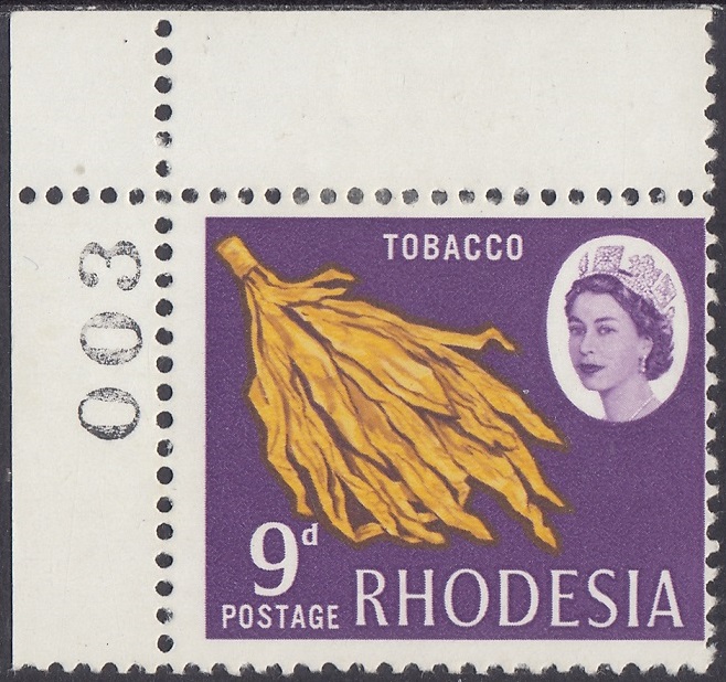 Rhodesia Rhodesia Philately: 1966 Definitive Issue – 9d Tobacco thedigitalphilatelist 09/02/1966 Details Subject: Tobacco Designer: Victor Whiteley Printer: Harrisons and Sons Ltd, London Process: Photogravure Paper: White paper with clear gum Watermark: None Perf: 13.5 x 13 (comb) Cylinders: 1A 1A Sheet: R10 x 6 (60 stamps) Quantity: 1,800,000 Sheet Numbers References The Encyclopaedia of Rhodesian & Zimbabwe Stamps 1964-2022 Share this: Share on Facebook (Opens in new window) Facebook Share on X (Opens in new window) X Like this:Like Loading... Related