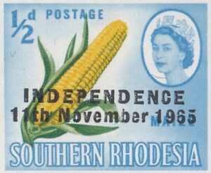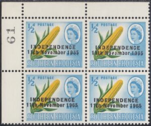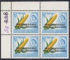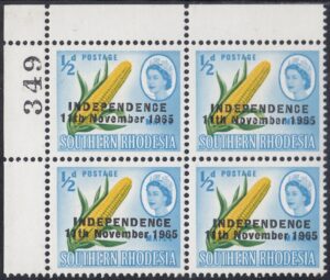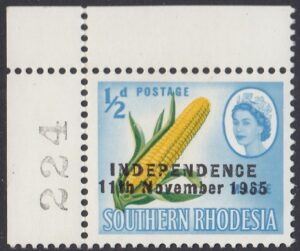 The source of this design was an artist’s impression of a partly exposed cob, and it was originally intended for the 3d stamp, in two colours – “corn-yellow” and blue. The addition of a third colour, yellow-green for the leaves, was subsequently requested, and the fact that this would add half as much again to the production costs of the stamp created a problem: the print order for the 3d (the normal postage rate in Rhodesia) was about 36 million!