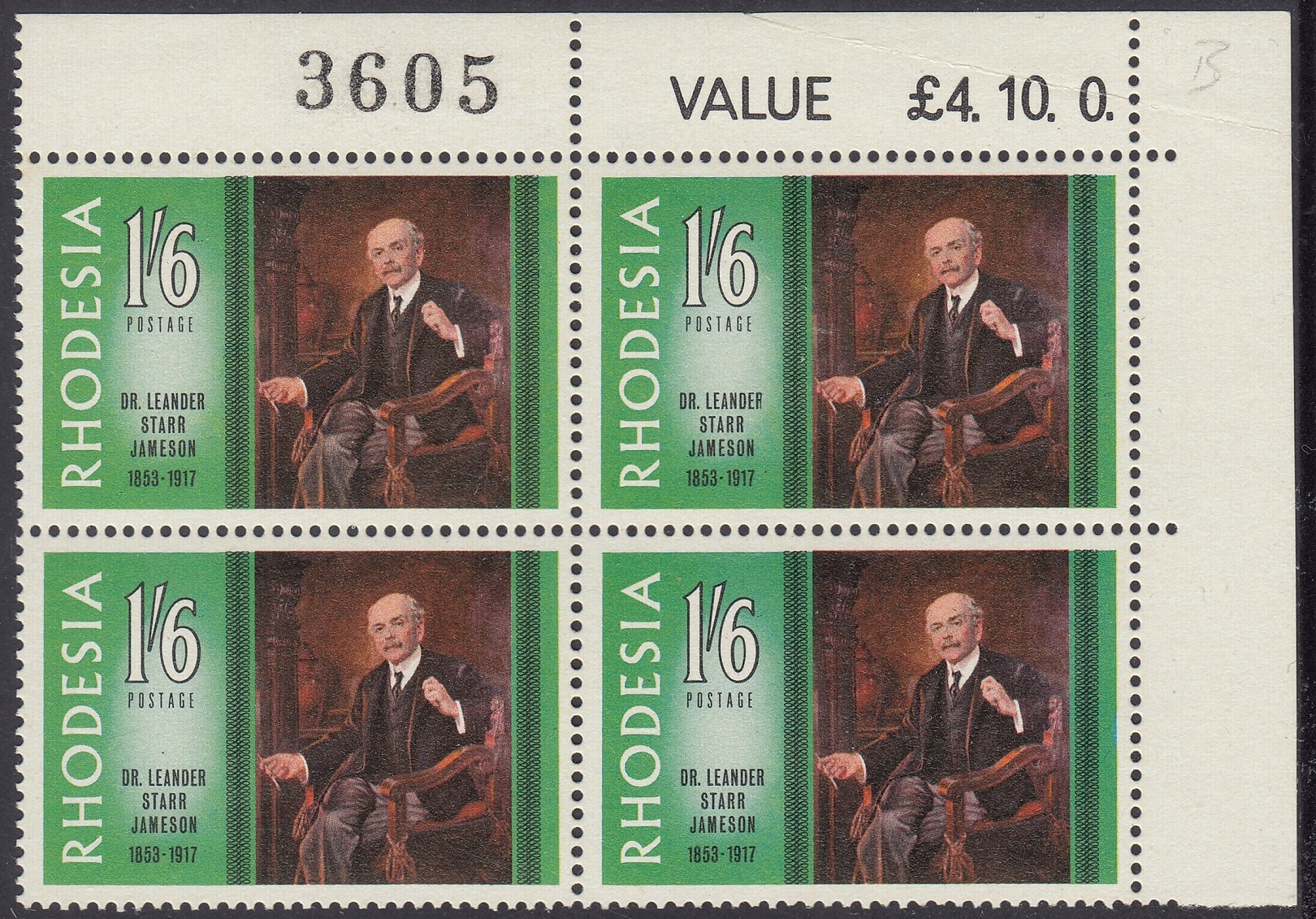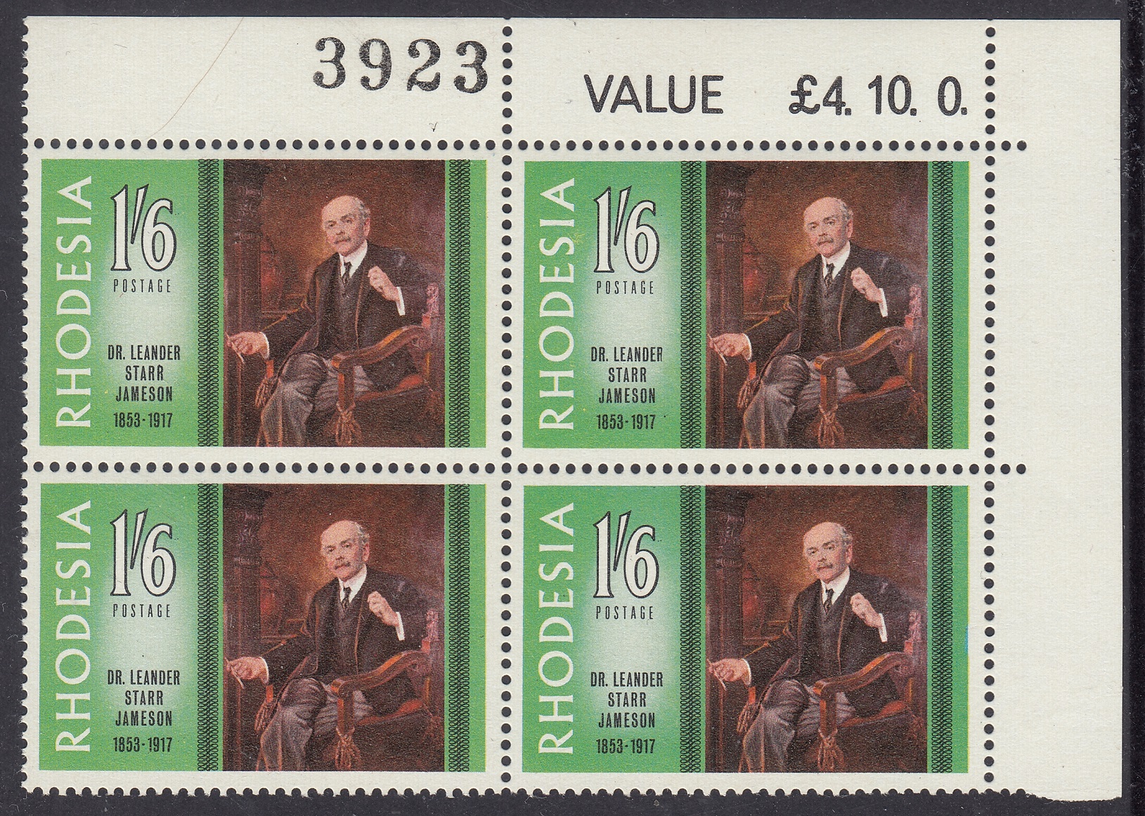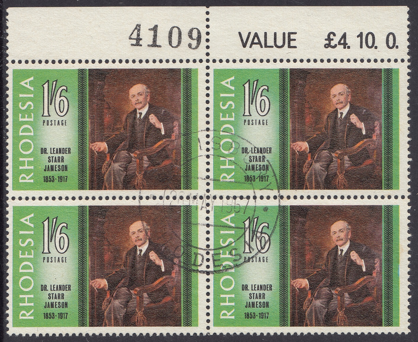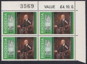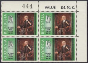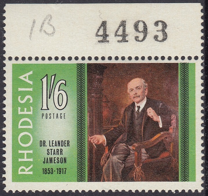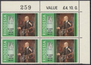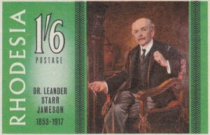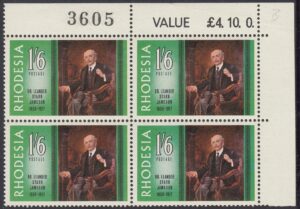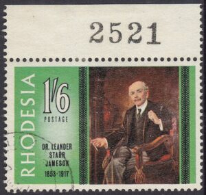 The portrait of Dr. Jameson repoduced on this stamp is one that was painted by Frank Moss bennett and is now displayed in the Rhodesia Parliament building. Frane Moss Bennett, who was born in Liverpool, exhibited in the Royal Academy in the early twentieth century and was better known for his portraits, which at one time enjoyed some vogue but which are now of no great value. He painted the portraits of three of the early Administrators of Rhodesia – Dr. Jameson, Early Grey and Sir Drummond Chaplin – which were included in a presentation of portraits of all Administrators made to the Rhodesia Government by the British South Africa Company in October, 1939, on the occasion of the Golden Jubilee of the Company’s Charter.