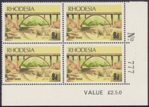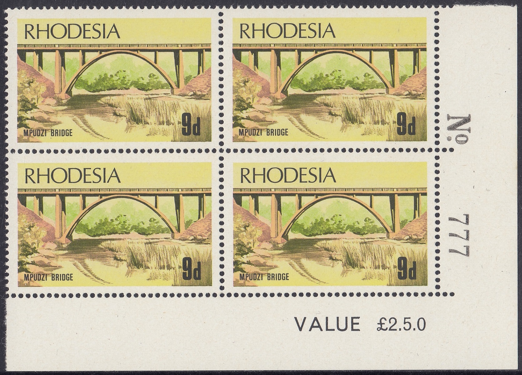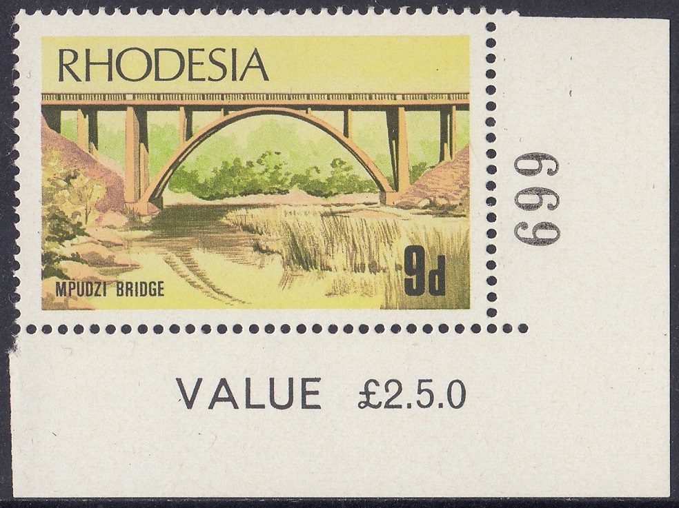 The subject of this stamp is the bridge over the Mpudzi River 26 miles from Umtali on the Umtali-Birchenough road. The single 100-foot span which rises 40 feet from the river is an open spandrel twin-rib arch with a trestle approach. The bridge has a double carriageway and an overall length of 220 feet. It was designed and built by the Southern Rhodesia Government at a cost of £45,643 and was completed in September, 1961.