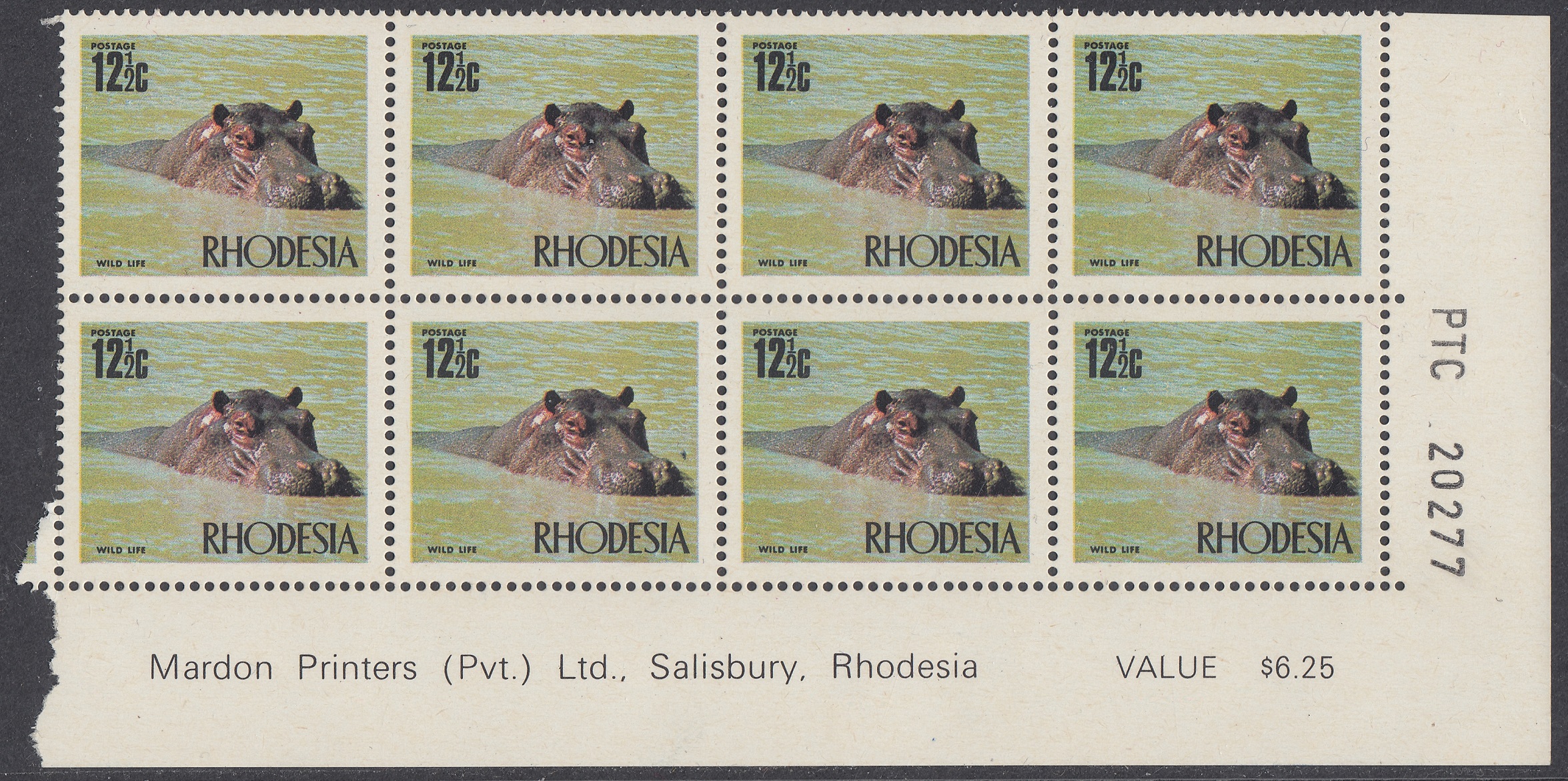 Wild Life is the subject of this stamp, which shows a hippopotamus lazing on the surface of a river. Rhodesia is among the leading countries in the world in wild life conservation and her National Parks and Game Reserves provide a secure home for her rich fauna.