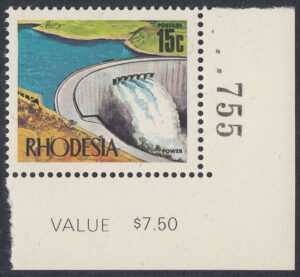 Power, the life blood of all development, is featured on this stamp, which shows the great Kariba Dam. This is one of the world’s finest technological achievements. From its enormous transformer and generator halls spreads a vast network of more than 9,500 miles of power lines. The double-curvature concrete arch dam, 420 feet high and 2,025 feet long, carries a 40-feet-wide road along its crest. There are six massive flood-gates to control the flow from the 170-mile-long and 20-mile-wide man-made lake.