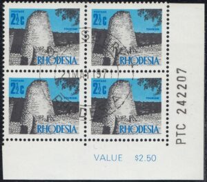 Tourism, which is rapidly expanding, is represented by this illustration of the controversial Zimbabwe Ruins. The conflicting opinions of archaeologists, attributing the origin of the ruins either to the indigenous Bantu people or to a bygone Arab or Phoenician civilization, serve only to heighten the mystery of the ruins and their attraction to visitor and resident alike.