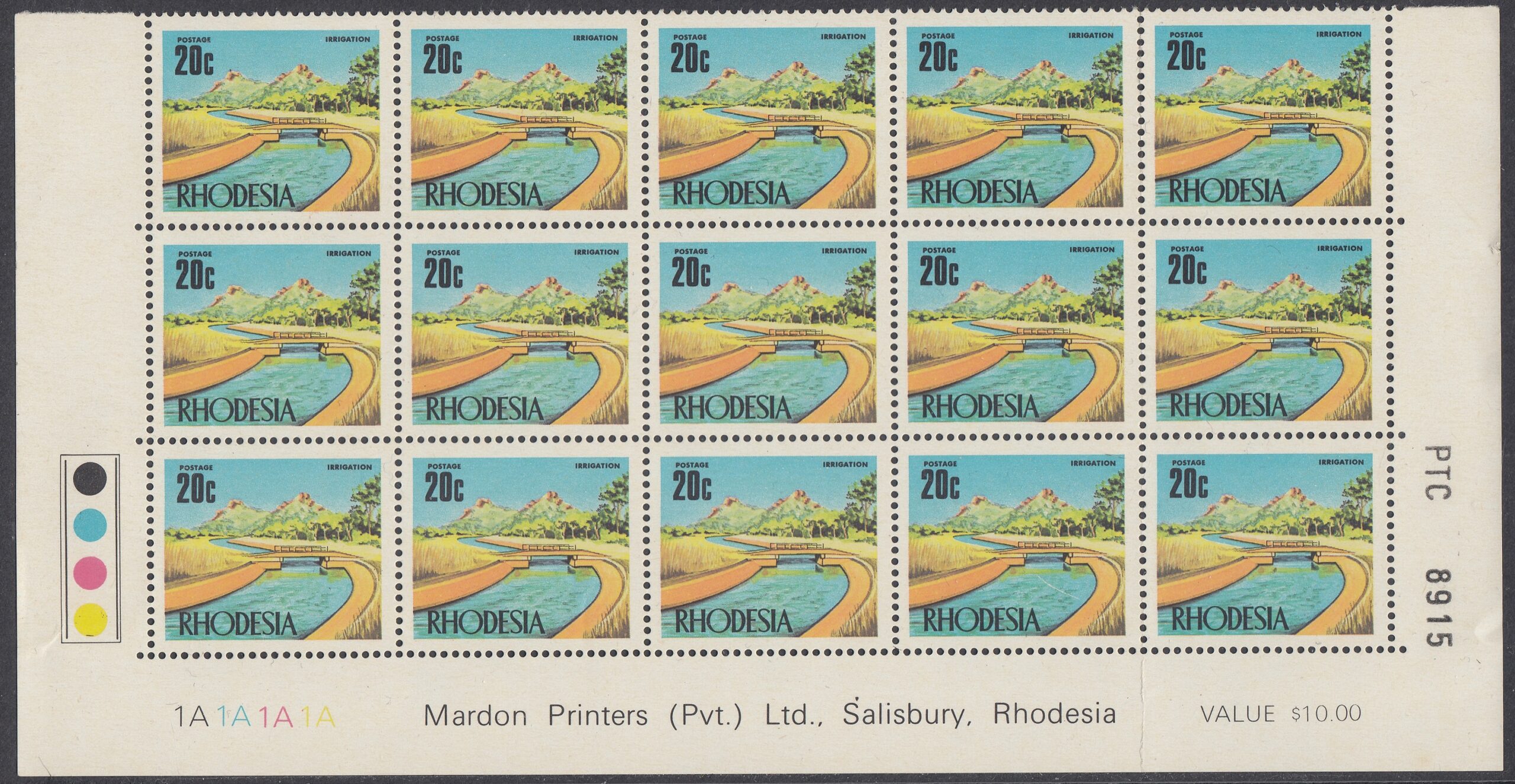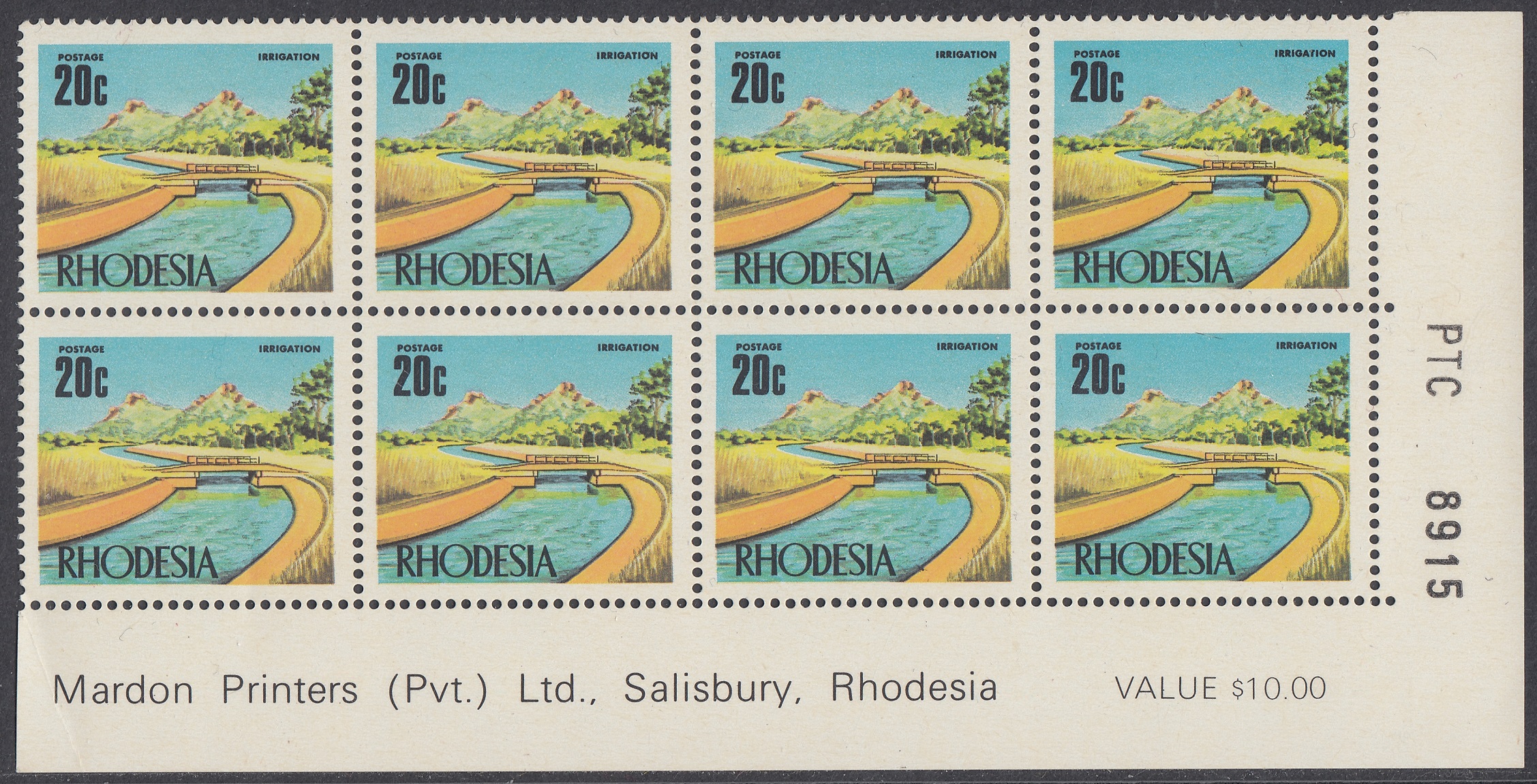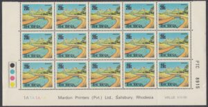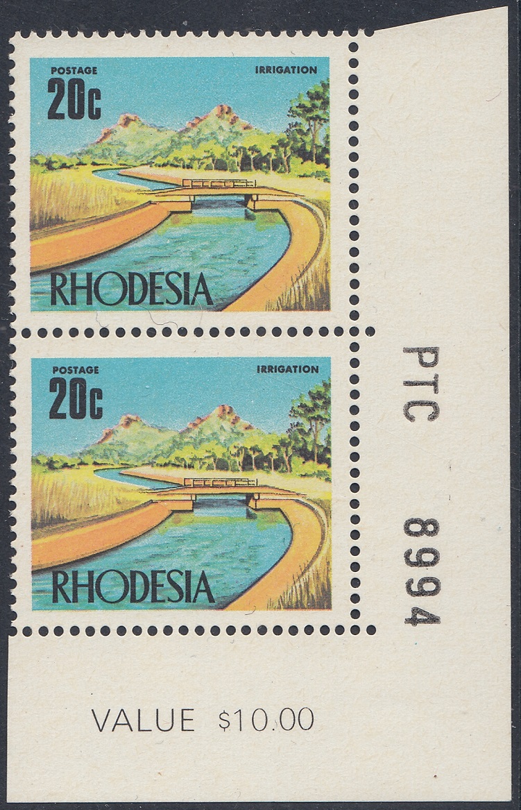 Irrigation is the theme of this stamp, which depicts a typical irrigation canal in the Low Veld. Rhodesia has deservedly earned a high reputation in the field of water conservation. Vast areas of almost barren virgin bush are being transformed into green productive agricultural lands making significant contributions to the economy and providing employment, food and social services to many who in the past existed at subsistence level.