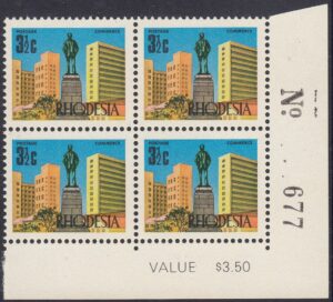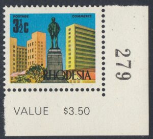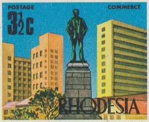 Commerce is symbolized in this stamp by a complex of buildings with a statue of the Founder, Cecil John Rhodes, in the foreground. The first government in Rhodesia was provided by a commercial organisation, the British South Africa Company, and Rhodesia’s modern history can be said to date from 1899 when, in a commercial transaction, Rhodes signed a contract with Major Frank Johnson for £90,000 to bring the Pioneer Column into what is now Mashonaland to take up the concession granted by Lobengula, King of the Matabele.