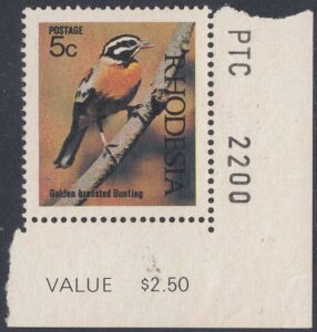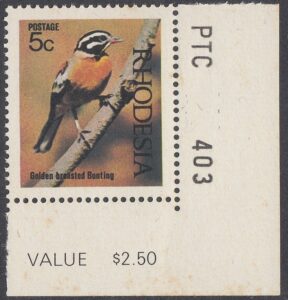 The subject is the Golden-breasted Bunting, which is found throughout Rhodesia but which is less numerous in higher areas. It is a bird that can become very tame.