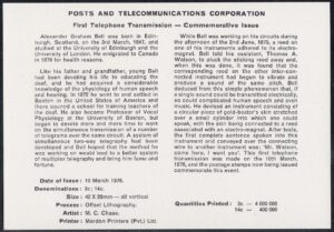 While Bell was working on his circuits during the afternoon of 2nd June, 1875, a reed on one of his instruments adhered to its electromagnet. Bell told his assistant, Thomas A. Watson, to pluck the sticking reed away and, when this was done, it was found that the corresponding reed on the other inter-connected instrument had begun to vibrate and produce a sound of the same pitch. Bell deduced from this simple phenomenon that, if a single sound could be transmitted electrically, so could complicated human speech and even music. He devised an instrument consisting of a circular piece of gold-beater’s skin stretched over a small cylinder into which one could speak, with the skin being connected to a reed associated with an electro-magnet. After tests, the first complete sentence spoken into this instrument and conveyed over the connecting wire to another instrument was: “Mr. Watson, come here, I want you”. This first telephone transmission was made on the 10th March, 1876.