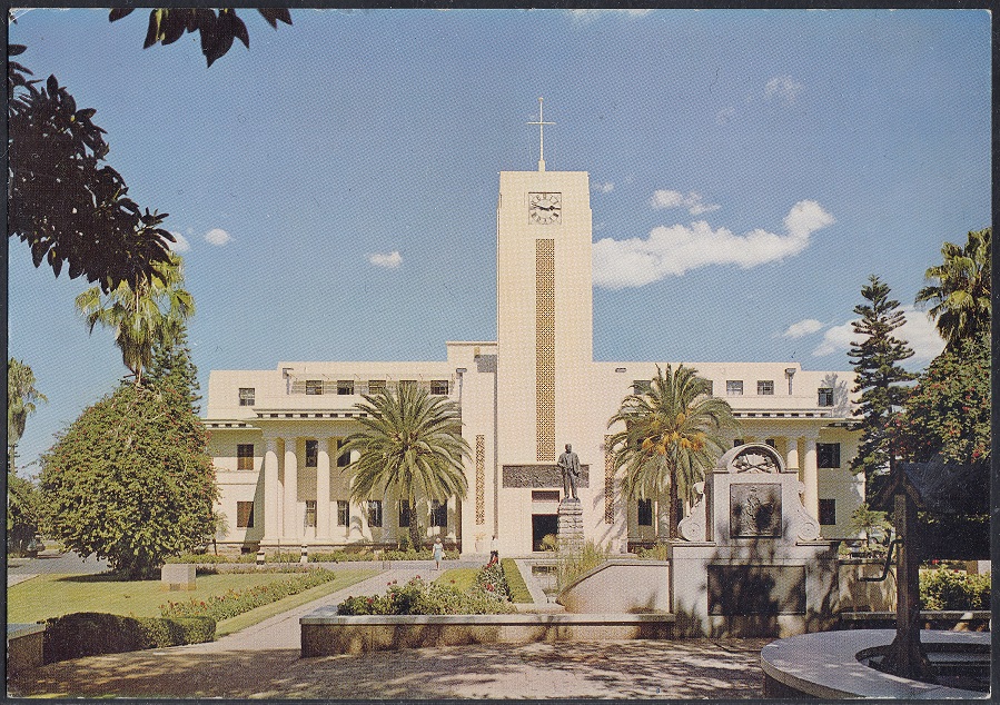 The clock and chimes were presented by Mrs. Elwyn L. Wynne and were set in motion by her on 4 November 1940, the same day that Lady Stanley (the Governor’s wife) unveiled the bas-relief which pictured the Indaba with Rhodes and the Indunas, which was located over the door to the council offices at the base of the tower.