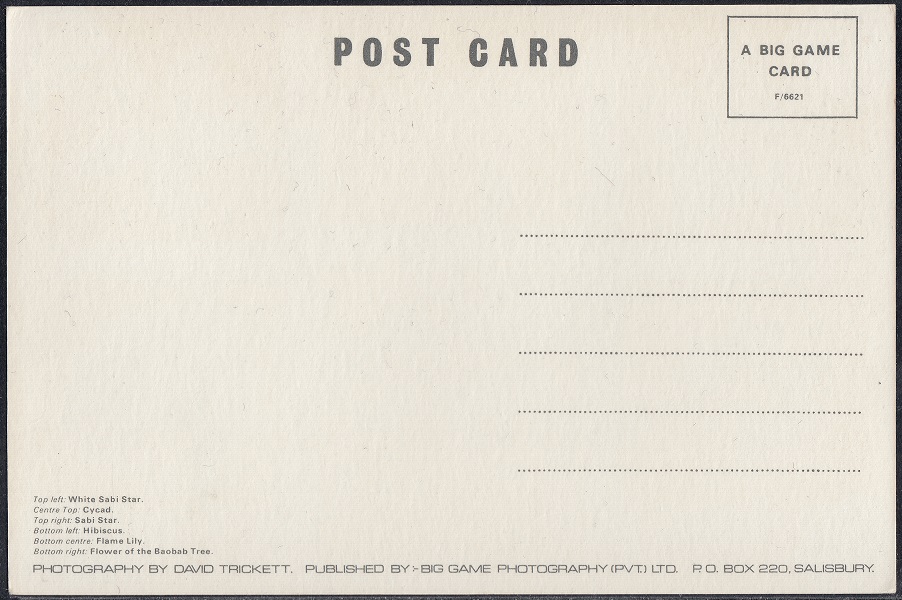 The Flame Lily (Gloriosa superba) is Rhodesia’s national flower. It is often found near or on rocky kopjes in good humus soil, and visited by the migrating African Vagrant butterflies when it blooms in December. The Shona name of Kajongwe is particularly apt for, as the wind shakes the plant, so the bright red petals twitch like a rooster’s comb.