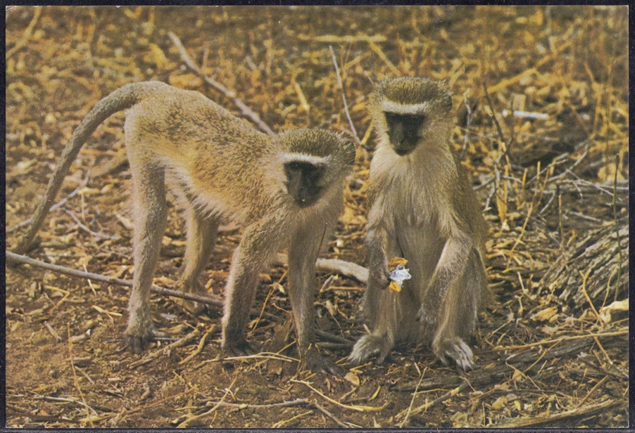 About 4½ ft. overall, including 2½ ft. of tail; greyish-yellow, black-faced, forehead white; single young born any time through the year; call, a chattering cough varied with whistling and grunts; common in wooded areas throughout Rhodesia; feeds on leaves, wild fruit, insects and birds’ eggs, also raids crops.