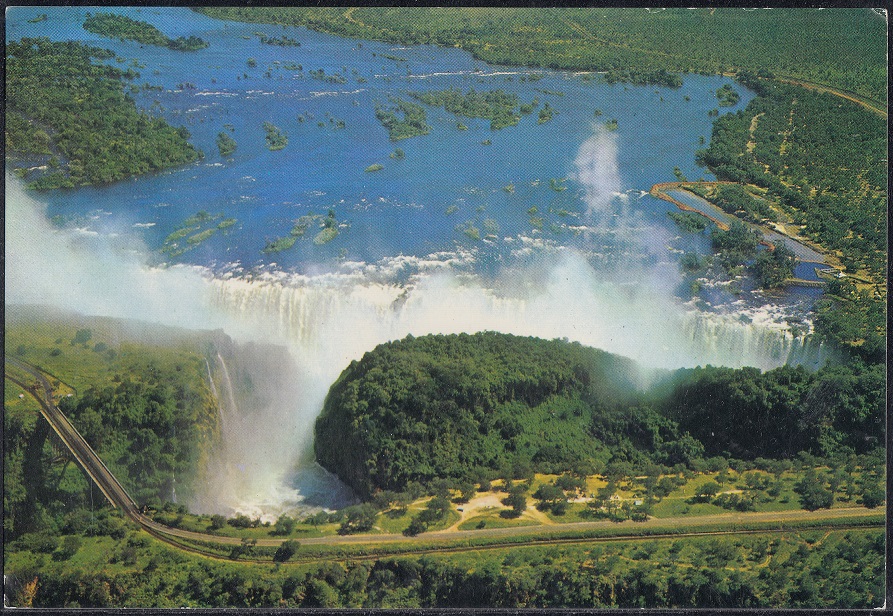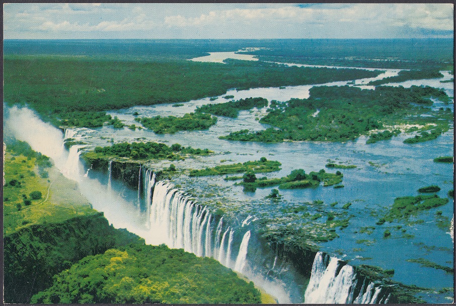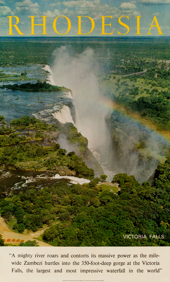 Victoria Falls (also known Mosi-oa-Tunya – The Smoke That Thunders) is a waterfall on the Zambezi River. It is located between Zambia and Rhodesia and is one of the world’s largest waterfalls.