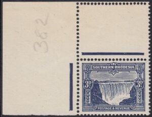 Southern Rhodesia Southern Rhodesia Philately: 1931 2nd Definitive Series – 3d Victoria Falls thedigitalphilatelist 01/04/1931 Details Subject: Victoria Falls Designer: Printer: Waterlow & Sons Ltd, London Wall, London, E.C. (2d, 3d,) Process: Typographed Paper: Watermark: None Perf: 16 x 14 (comb) Plates: Sheet: Quantity: Sheet Numbers