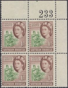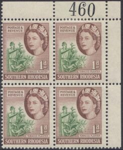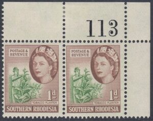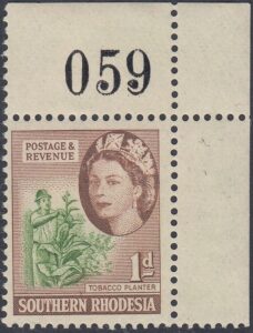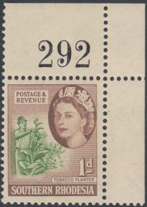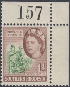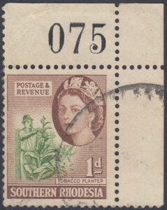 This stamp depicts a tobacco planter. The tobacco industry contributed a significant amount to the country’s foreign earnings. The illustration shows a tobacco planter removing suckers from the tobacco plant.