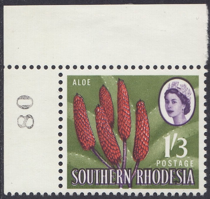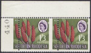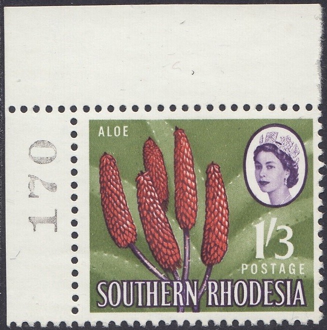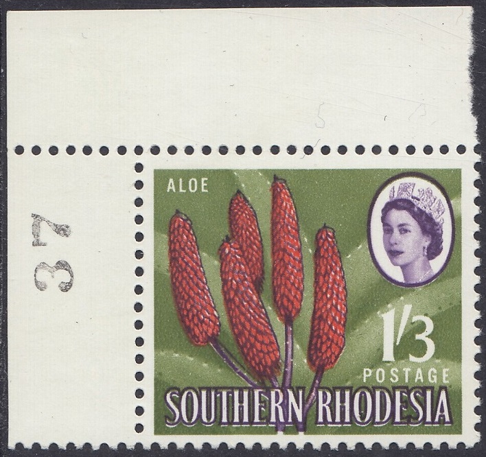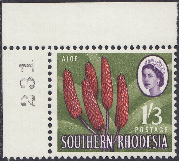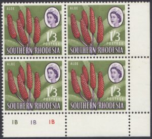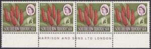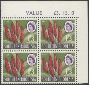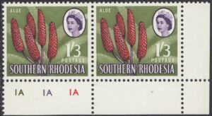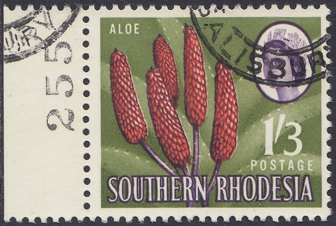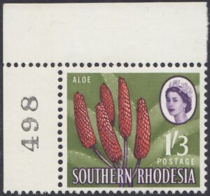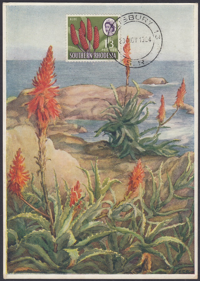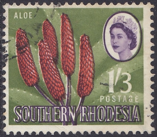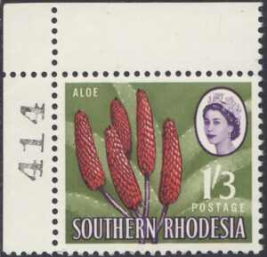 Kodachrome transparencies and a coloured picture from a tourist brochure, Aloes and Cycads, provided a guide to this formalized interpretation of the extraordinary Aloe excelsa, which in some districts grows tree-like to a height of 20 feet, but usually to 10 or 12 feet. The brown-red “pinnacles”, not unlike the corncob on the 1d, have overlapping petals similar to a fir-cone and these tend to open out rather more than is shown in the artwork. The artist’s ghostly suggestion of the leaf form is, however, most effective as a background. Note the spikes or thorns which fringe the thick, cactuslike leaves. The succulent leaves grow at the apex of the stem to a length of 3 feet and spread over the ground like enormous octopus-tentacles. Aloes grow widely throughout Southern Rhodesia—there is a unique collection in the Ewanrigg National Park—and they flower during the winter months of June, July and August.